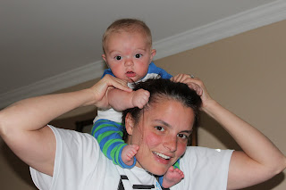 I don't know why I thought that it was a good idea to give my almost 5-month old a ride on my shoulders....especially since he has really been practicing grasping things lately! It may have been a better idea for Russ to try this instead since he is bald. Russ says that Hank's expressions make it look like he is riding a bucking bronco. (The third picture down really shows this the best.) These are terrible pictures of me, but they are so funny of Hank that I had to forgo my vanity and post them anyway. Enjoy!